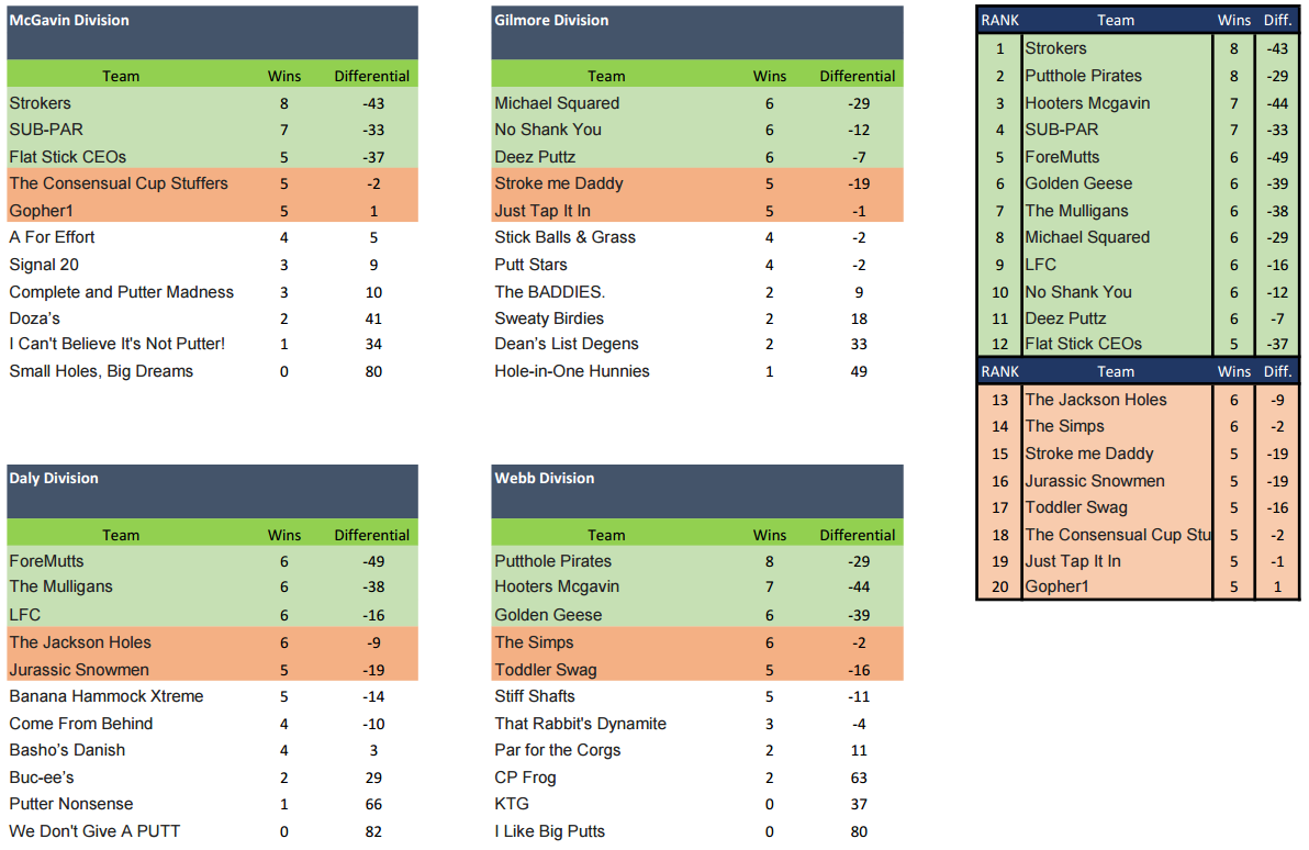 Playoffs: Rankings will be set based on overall performance across all divisions. Depending on number of teams participating, a portion will be guaranteed playoff entry while others must compete in a win-or-go-home play in round. Play in round will be 9 holes, with winner of roshambo deciding front or back 9 starting AT 6PM SHARP. Remainder of playoff rounds will start at 630pm and be 18 holes with a shotgun start until no longer necessary. Playoffs are single elimination with the exception of the 3rd/4th place game.